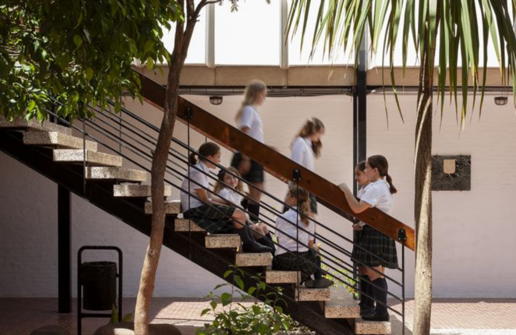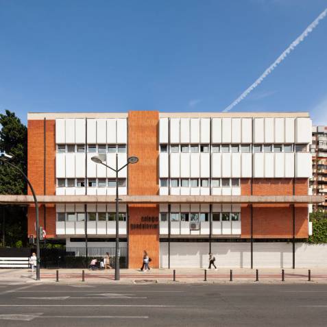 Influenciado por la arquitectura de Mies van der Rohe, en el Colegio Guadalaviar, el arquitecto se propuso ensayar los conceptos creativos derivados del ‘less is more’ miesiano: la arquitectura se convierte en función utilitaria, y la función determina la forma.