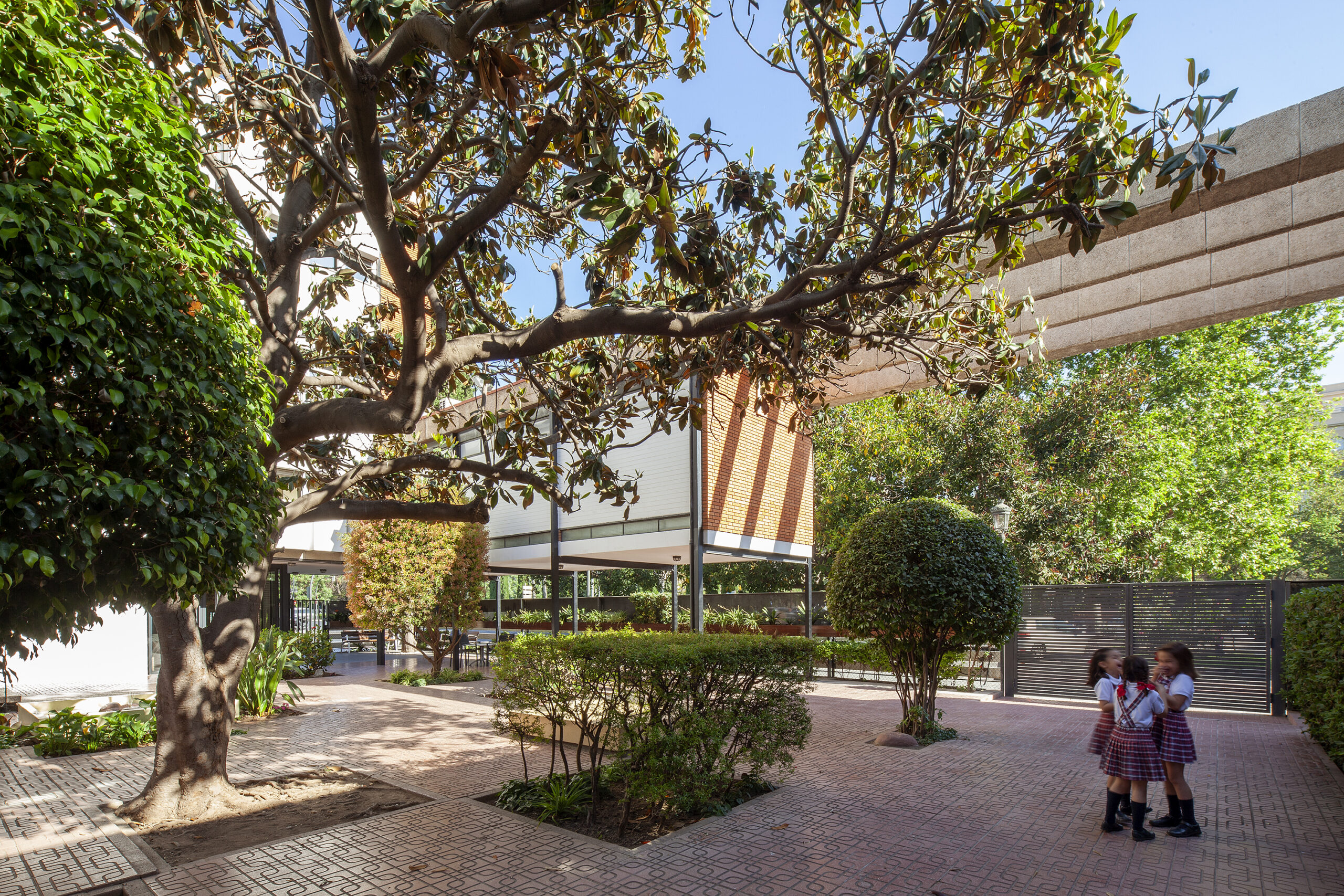 La Escuela finalmente construida respondía a modernas prácticas pedagógicas y distribuía el amplio y variado programa en dos tipos de edificaciones que configuraban un armonioso paisaje artificial. Una anterior en forma de “U”, despegada parcialmente del suelo para conciliar la arquitectura con la naturaleza circundante, desarrollaba en torno a un patio pavimentado sus desiguales cuerpos que albergaban en dos de ellos la capilla y el programa específico de la enseñanza primaria, y en los otros dos, especialmente en el bloque alto, las dependencias generales y la residencia de profesoras. Y otra posterior formada por cuatro pequeños pabellones para párvulos, incluidos en un recorrido peatonal escalonado y pegados al suelo con objeto de proporcionar fáciles expansiones hacia el recinto ajardinado propio y clases al aire libre. Volumétricas puras, funcionalidad distributiva, racionalidad constructiva con especial interés hacia el detalle y la aplicación de nuevas tecnologías, ajuste de escalas con transparencias, interpenetraciones, atados… todas estas cualidades son reflejo de las influencias de Mies van der Rohe, así como de la vertiente californiana del Movimiento Moderno. Texto extraído de la “Guía de Arquitectura de Valencia.